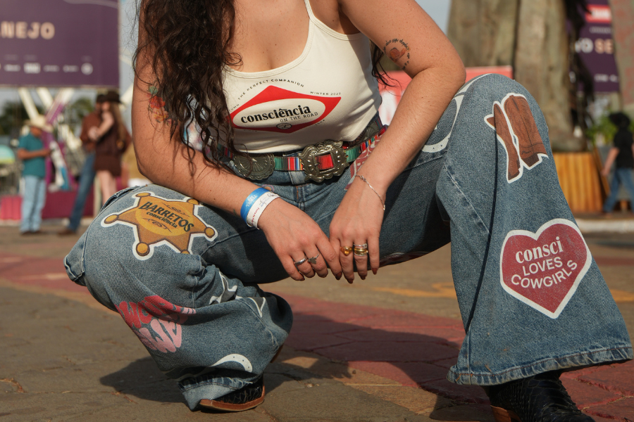É super possível usar peças coloridas e com estampas, sem perder a sua elegância, destacando o seu estilo! Em pensar que, em Paris, existia uma lei que proibia as mulheres de saírem de casa com calça, sem pedir autorização da polícia. Só na década de 80 que ela se popularizou pelo mundo. Com diversas cores, modelos, estilos, texturas e estampas. Ou seja, mulheres precisaram caminhar para que hoje a gente pudesse correr e nadar de braçada nessa imensidão de possibilidades e estilo. Assim, eu te incentivo a abraçar a pluralidade do jeans. Por falar em pluralidade e jeans, a Consciência Jeans é especialista no assunto. Super antenados na tendência, a coleção Consciência Rodeio, em parceria com a Ana Castela, foi dividida em cápsula. Cada linha representa não só um estilo, mas conta uma história através das suas modelagens, bordados, estamparias, cores e, claro, a sua versatilidade.